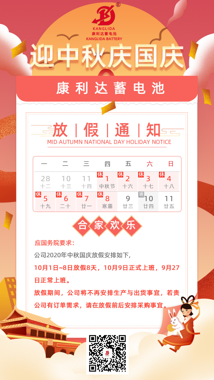 中秋国庆放假时间已定,放假期间,公司将不再安排生产出货事宜,若贵公司有订单需求,请在放假前后安排采购事宜,康利达蓄电池全体员工祝您节日愉快!
