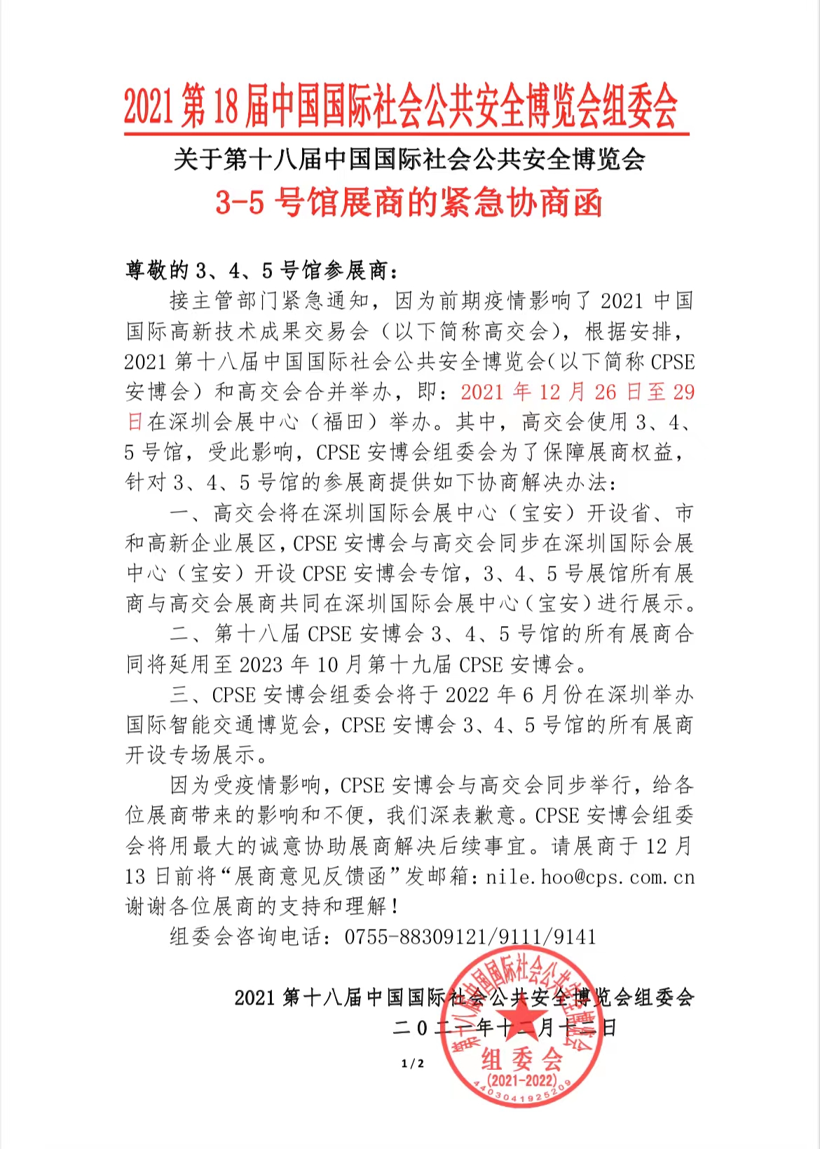 接主管部门紧急通知,因为前期疫情影响了2021中国国际高新技术成果交易会(以下简称高交会),根据主管部门安排, 2021 第十八届中国国际社会公共安全博览会(以下简称 CPSE 安博会)和高交会合并举办,即:2021 年 12 月 26 日至 29 日在深圳会展中心(福田)举办。其中,高交会征用原安博会的 3、4、 5 号馆,我司5号馆5A11展位也在被征用范围内,导致无法按照原计划参加本次展会。受此影响,我司决定退出此次展会。因展会调整给大家带来的不便,我们深表歉意,敬请谅解!