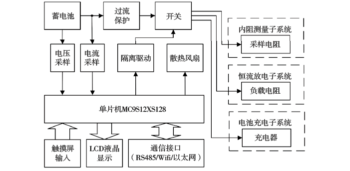 为完成蓄电池内阻、电压、电流等参数的测量,实现蓄电池SOH及SOC的准确估算,本文设计的便携式蓄电池SOH及SOC智能检测系统的硬件实现方案如图3所示。该系统以高速、低功耗、高抗干扰的单片机MC9S12XS128为控制中心,主要由过流保护电路、电压及电流采样电路、隔离驱动电路、内阻测量子系统、恒流放电子系统、电池充电子系统、LCD液晶显示和通信接口等部分组成。