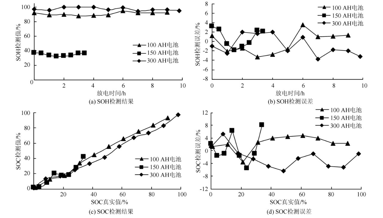 为验证本系统对不同蓄电池的SOH及SOC的检测效果,采用额定容量分别为100、150、300AH的12V蓄电池,分别检测放电过程中SOH和SOC的变化。实验时,首先使蓄电池达到完全充满电状态,然后检测出蓄电池的当前健康状态SOH和容量状态SOC,接着用蓄电池监测仪ART-5780进行0.1C恒流放电测试,放出10%左右的容量后再检测SOH和SOC。循环检测和放电测试,直至蓄电池完全放电。获得总放电容量Cmax后,通过逆向计算得出每次检测时的实际剩余容量Cremainn,根据式(1)和(2)可算出SOH和SOC的真实值。最后得到的SOH真实值分别为91%、34%和98%,实验结果如图5所示。